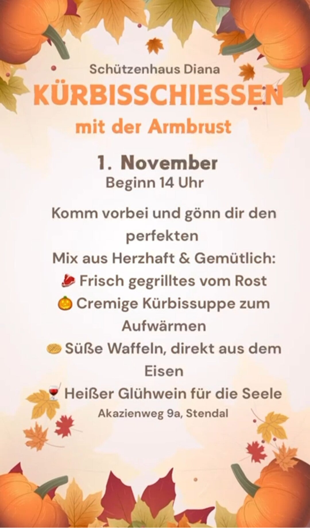 Am 27.10.2024 findet unser Kürbisschießen im Akazienweg 9a in Stendal statt. Es wird mit der Armbrust auf einen Kürbis geschossen. Die Partner sind gern eingeladen mitzukommen. Lars macht Mittagessen.